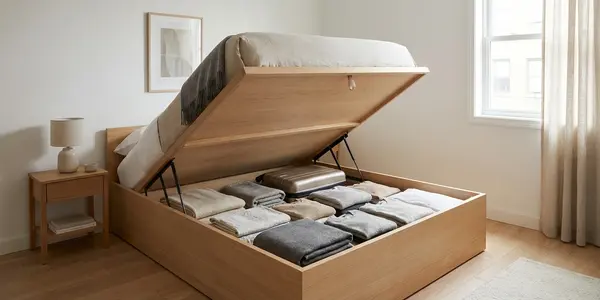 تخت باکس‌دار با فضای ذخیره‌سازی مخفی برای نگهداری پتو، لباس فصلی و وسایل اضافی در اتاق خواب کوچک